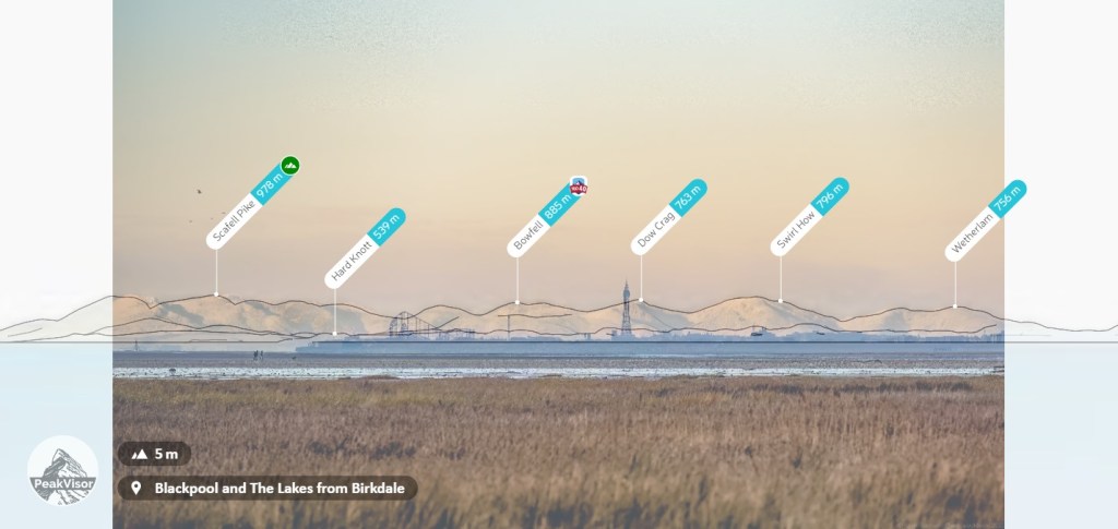 A great website/app called Peak Visor gives a fantastic annotated view of the peaks in the image. Scafell Pike is clearly visible, and according to Google Maps it is at a distance of 56.75 miles from my spot. Blackpool Tower is a mere 12 miles from that spot. I remember a hovercraft service that I never went on growing up as a kid in Liverpool that serviced Blackpool from Southport if memory serves me correctly – which beats the hour long trip following the coast by road!